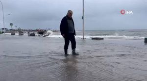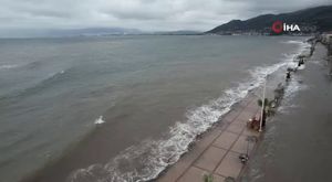 Marmara Denizi'nde etkili olan fırtına nedeniyle oluşan dev dalgalar, Bursa'nın Gemlik ilçesinde sahil yolunu trafiğe ka...