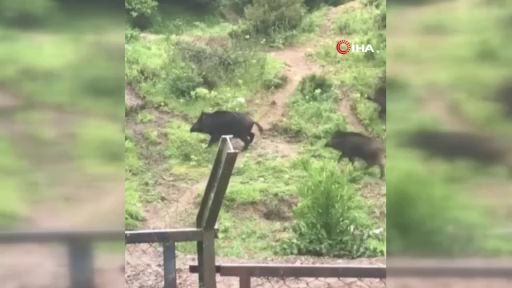 Eyüpsultan'da şehre inen aç domuzlar köpeğin mamasını yedi. Köpek, domuzların mamasını yemesine havlayarak tepki gösterirken, o anlar cep telefonu kamerasına yansıdı.