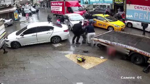Pendik’te bir motokurye, trafikte tartıştığı sürücüye ait otomobilin aynasını kırdı. Duruma sinirlenen araç sürücüsü, otomobilini motokuryenin üzerine sürdü. Çarpmanın etkisiyle sürüklenerek otomobil ile park halindeki çekicinin arasında ezilen motokurye yaralandı. O anlar güvenlik kamerasına yansıdı.