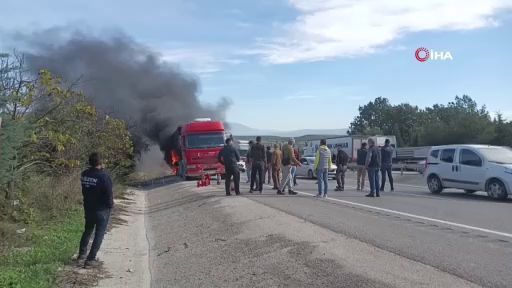 Bursa-İzmir Karayolu üzerinde bir kamyon seyir halindeyken alev alev yandı. Yangını gören herkes aracından yangın tüpünü kapıp müdahale etmeye çalıştı. Tüplerin yarısından fazlasının boş çıkması herkesi şok ederken, kamyonun lastiklerinde başlayan yangın kısa sürede 400 litrelik benzin deposuna ulaşınca paniğe sebep oldu.