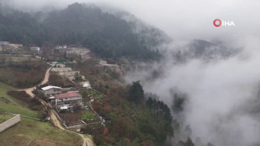 Bursa'da yüksek rakımdan dolayı bulutların içerisinde kalan Gökçeören Mahallesi adeta Trabzon yaylalarını andırdı.