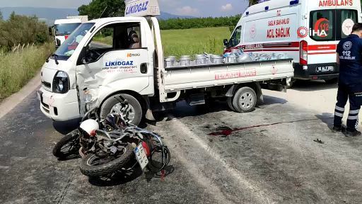 Bursa'nın Orhangazi ilçesinde bir motosiklet yan yoldan ana yola çıkış yapmak isteyen tüp yüklü bir kamyonete yandan çarptı. Motosiklet sürücüsünün ağır yaralandığı kazada kamyonet sürücüsü de hafif yaralandı.