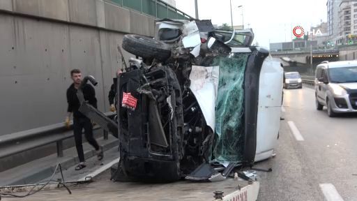 Bursa’da direksiyon hâkimiyetinin kaybedilmesiyle önce bariyerlere ardından öndeki minibüse çarpan minibüs devrildi. Devrilen minibüsün sürücüsü yaralandı.