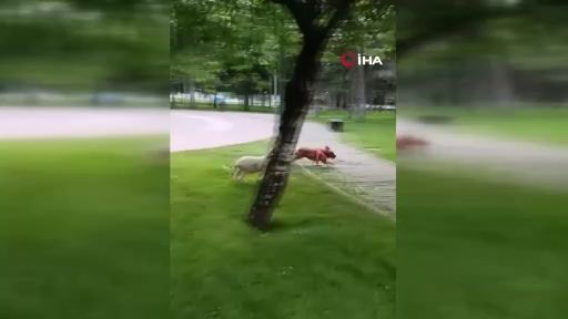 Bursa'da kuzunun bir parkta köpeği kovalaması ortaya renkli görüntüler çıkardı.