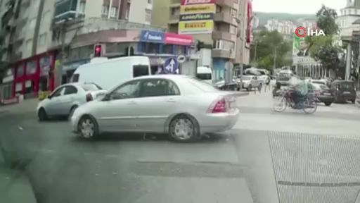 Merkez Osmangazi ilçesine bağlı Gazi Orhan Bey kavşağında ilerleyen motosiklet sürücüsü, önünde duran aracı son anda fark etti. Frene basan motosikletli otomobile çarpıp havaya savruldu. O anlar araç içi kamerasına yansırken, sürücü şans eseri kazayı ufak sıyrıklarla atlattı.