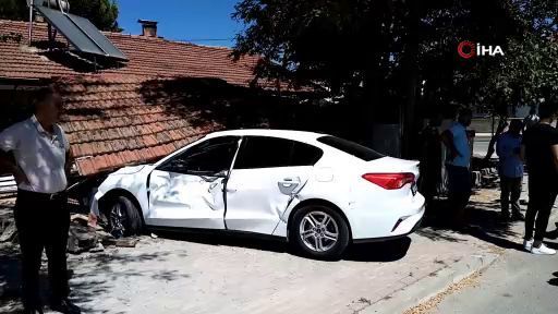 Bursa’nın İnegöl ilçesinde kamyonla çarpışan otomobil, evin bahçe duvarını yıktı.