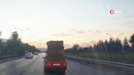 Bursa'nın İnegöl ilçesinde bir sürücü, aracının üzerinde saman balyaları taşıdı. O anlar amatör kameraya saniye saniye yansıdı.