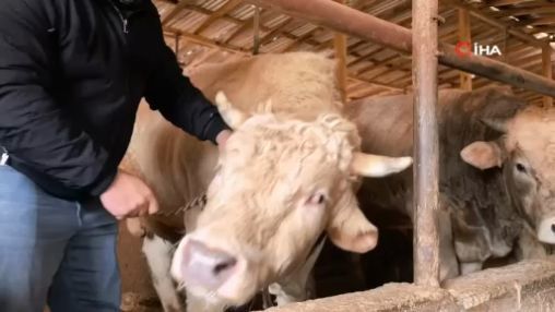 Bursa'da kurbanlık hayvan satışı yapılan çiftlikteki 1 ton 100 kilo ağırlığında 'Paşa' ismi verilen boğa, 500 bin liraya alıcısını bekliyor.