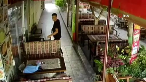 Bisikleti ile Bursa’dan Alanya’ya giden 18 yaşındaki genç bir kafede dinlenirken kimliği belirsiz bir kişi tarafından cep telefonu çalındı. O anlar güvenlik kamerasına yansıdı.