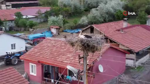 Çankırı’ya bahar mevsiminde göç eden leylekler yumurtlayarak kuluçkaya yattı. Havadan görüntülenmek isteyen bir leylek, dronu görünce yuvasındaki yumurtaları saklamaya çalıştı.