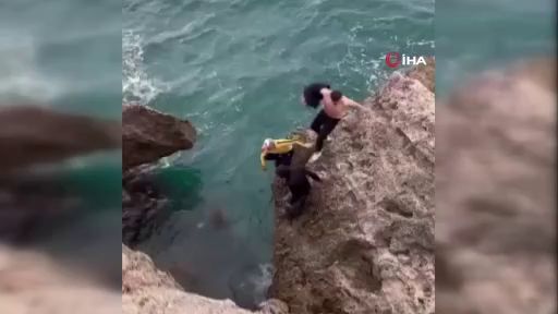 Antalya’da falezlerden denize atlayan kadını, vatandaşlar imece usulü kurtardı. O anlar cep telefonu kamerasınca saniye saniye kaydedildi.