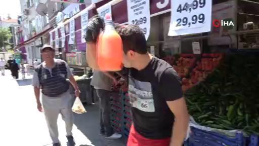 "Eyyam-ı Bahur" etkisinin sürdüğü İstanbul'da kavuran sıcaklar vatandaşlara ve turistlere zor anlar yaşattı. Taksim'de ise manzara değişmezken, Fatih'te bir manav ise ürünleri sularken kendisini de ıslatarak serinledi.