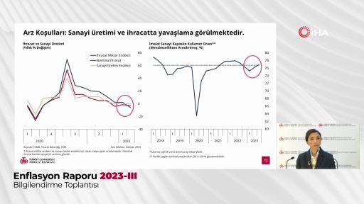 Türkiye Cumhuriyet Merkez Bankası (TCMB) Başkanı Hafize Gaye Erkan, 2023 yıl sonu enflasyon tahminini yüzde 22,3’ten 35,7 puan artışla yüzde 58’e çıkardıklarını, 2024 yıl sonu için ise yüzde 8,8’den 24,2 puan artışla yüzde 33’e yükselttiklerini belirterek, "2024 yılında dezenflasyonun sürdürülebilir şekilde başlamasını sağlayacak zemini dikkatle oluşturuyoruz. Dezenflasyon süreci dönemine girildiğinde göreli fiyatlarda geçici düzeltmeler, yerini kur istikrarı, iyileşen cari denge, mali disiplin, sermaye akımlarında kalıcı güçlenme ve artan rezervlere bırakacaktır” dedi. Böylece Merkez Bankası, 2023 yıl sonu ve 2024 yıl sonu enflasyon tahminlerini üç rapor döneminin ardından ilk defa yükseltmiş oldu.