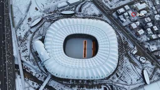 Bursa’da simge haline gelen mekanlar beyaza bürünürken, Timsah Arena Stadyumu'nun karla kaplı hali dron ile havadan görüntülendi.