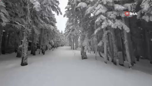 Doğa Koruma ve Milli Parklar 2. Bölge Müdürlüğü tarafından dron ile kayda alınan görüntüler, Uludağ'ın beyaza bürünmüş ağaçlar arasındaki güzelliklerini gözler önüne serdi.