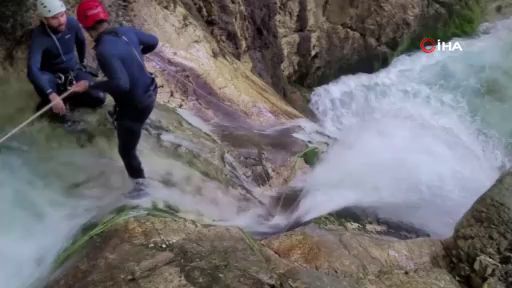 Bursalı dağcılar kar sularının erimesiyle coşan Uludağ'ın en dik şelalelerinden iple inerek daha önce hiç görülmeyen yeşil havuzları görüntüledi.